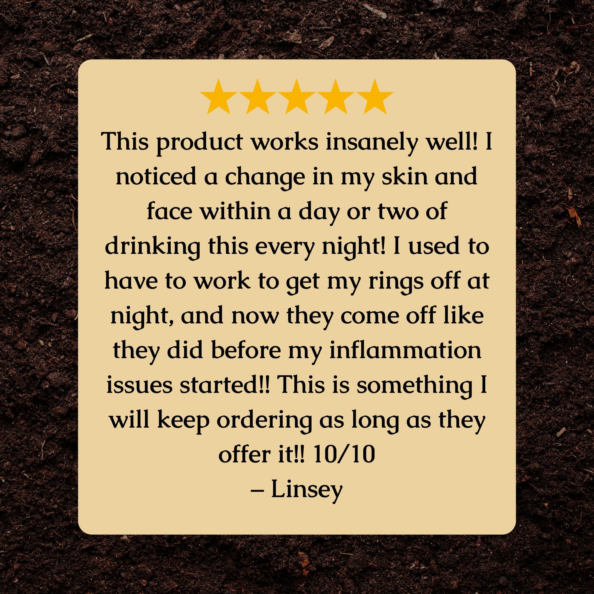 We use a combination of 100% organic bilberry leaf, burdock root, dandelion root, eleuthero root, American elderberry, Ceylon cinnamon, hibiscus flower, and Mexican sarsaparilla root. These herbs are great for fighting and lowering inflammation.