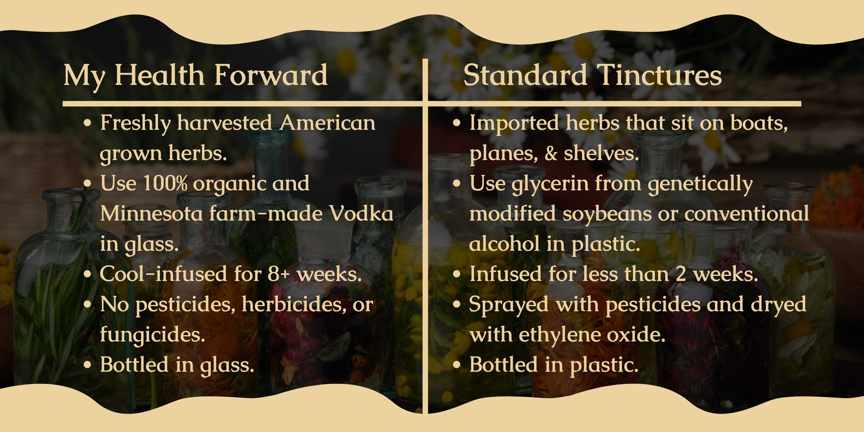 Most herbal tinctures and extracts are made by infusing herbs into solvents at high temperatures for only 1-2 weeks. The temperatures destroy many of the beneficial compounds. The short extraction period also does not infuse enough of the compounds. Glycerin is often used even though it is not as effective of a solvent. Glycerin is typically made with vegetable oils from genetically modified soybeans or unsustainably grown palm oil. Our herbs are also all American and freshly harvested whereas the industry typically uses old, imported herbs. We source the vodka in glass bottles and fill the tinctures into amber glass droppers.