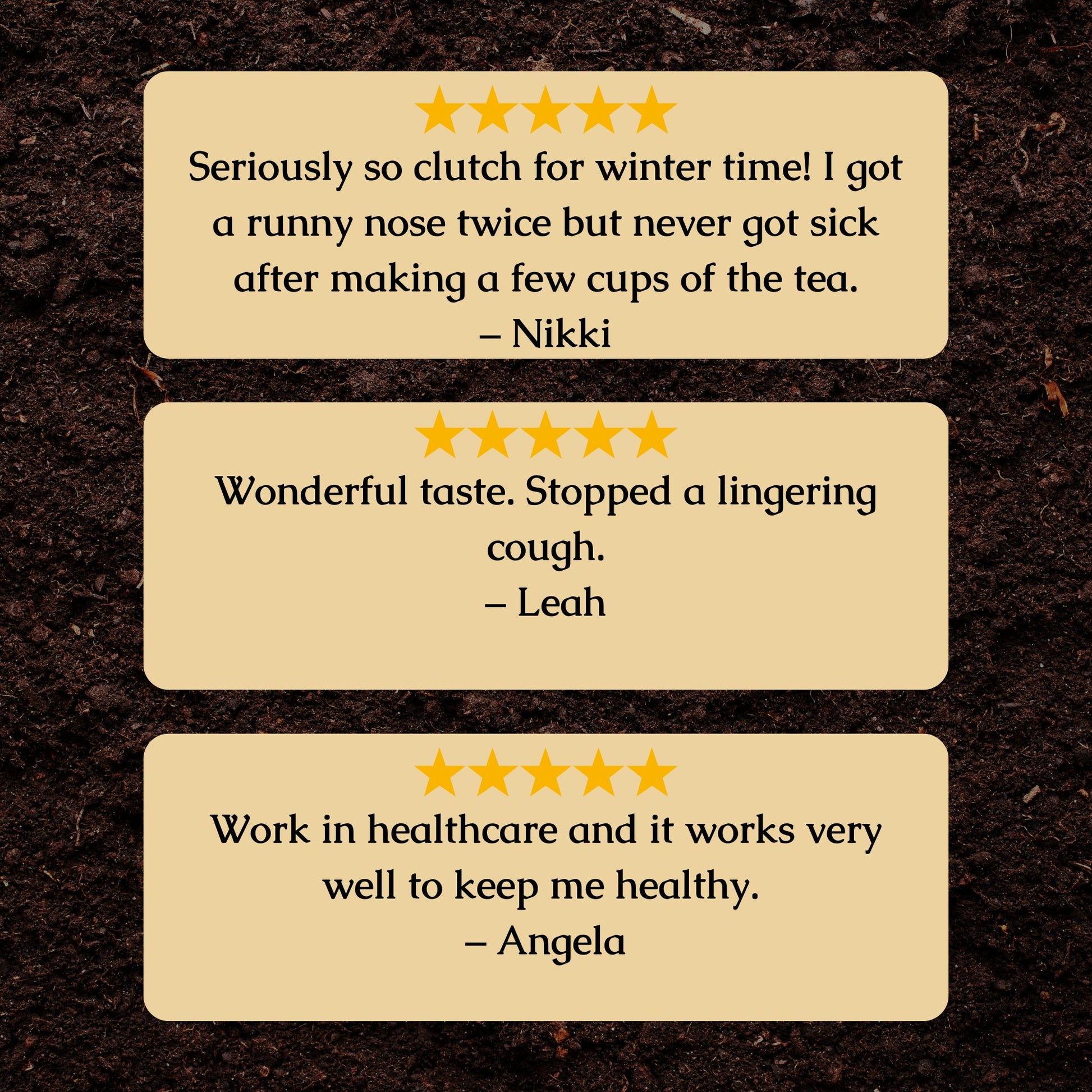 Our immune support tea is made with a combination of 100% organic ceylon cinnamon chip, American elderberry, fennel seed, ginger, purple coneflower (Echinacea purpurea), marshmallow root, and yarrow flower. The herbs in the immune support tea are great for supporting the immune system and fighting off sickness and colds.