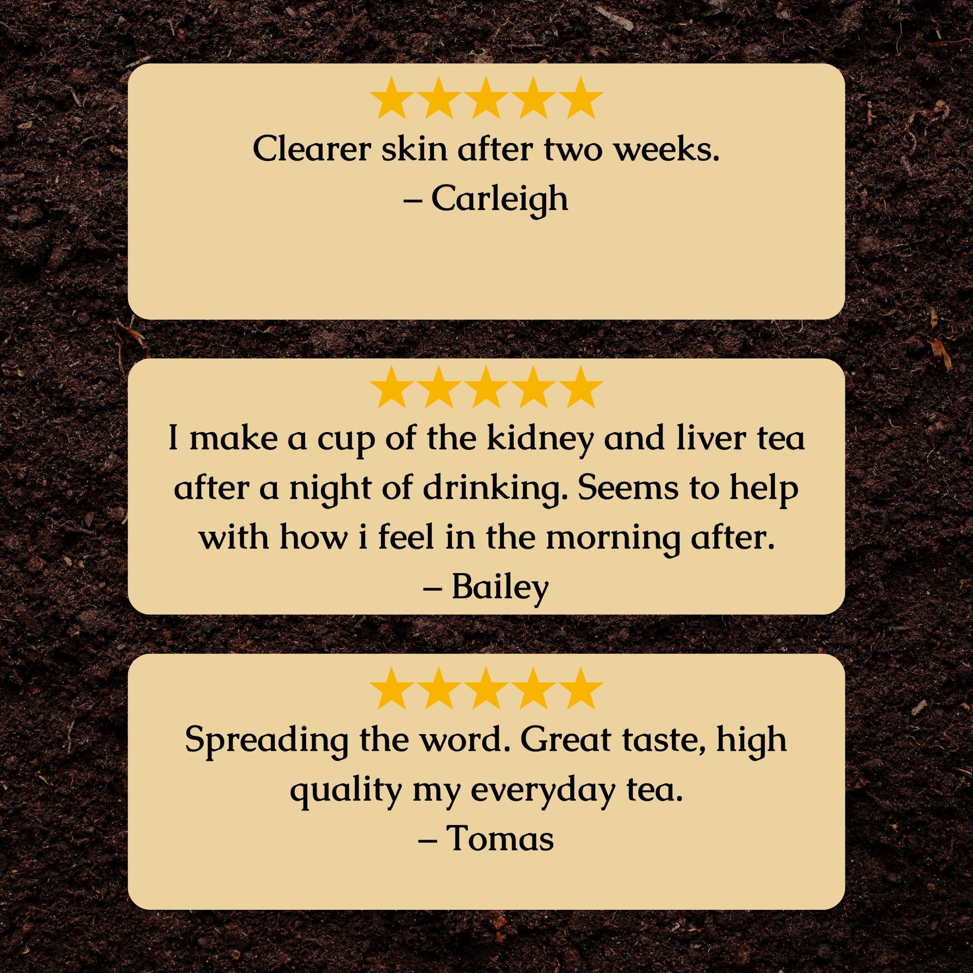 We use a combination of 100% organic 100% organic Dandelion Root, Orange Peel, Eleuthero Root, Burdock Root, Nettle, Mexican Sarsaparilla Root, and Chamomile Flower. These herbs are great for supporting kidney and liver function to filter and flush out toxins from the body. This is the best tea for protecting your kidney and liver health!